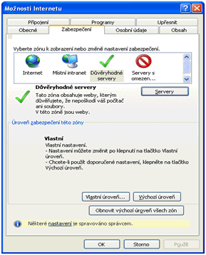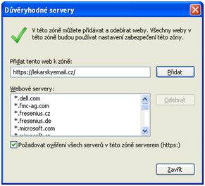V případě, že neuspěje ani výše uvedený postup, tak v pravém horním rohu Internet Exploreru klikněte Nástroje/Možnosti Internetu a na kartě Zabezpečení klikněte na Důvěryhodné servery a poté na tlačítko Servery a přidejte https://lekarskyemail.cz, viz obrázky: